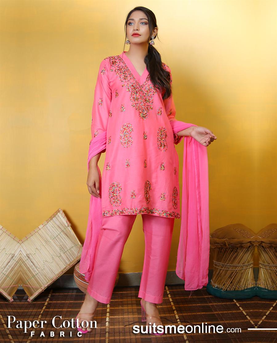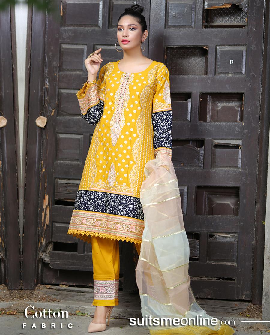 Latest and trendy cotton shirt with embriodery on front. It is paired with full embroidered trouser and dupatta with embroidered patti on border