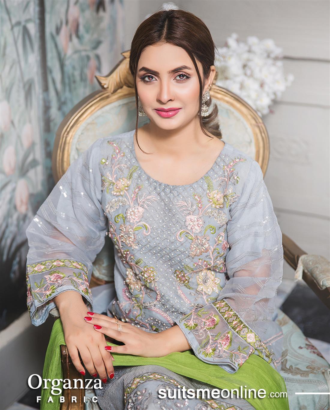 Classic traditional Organza suit with full embroidered shirt embellished with hand work all over. It comes with embroidered trouser and contrast chiffon dupatta.