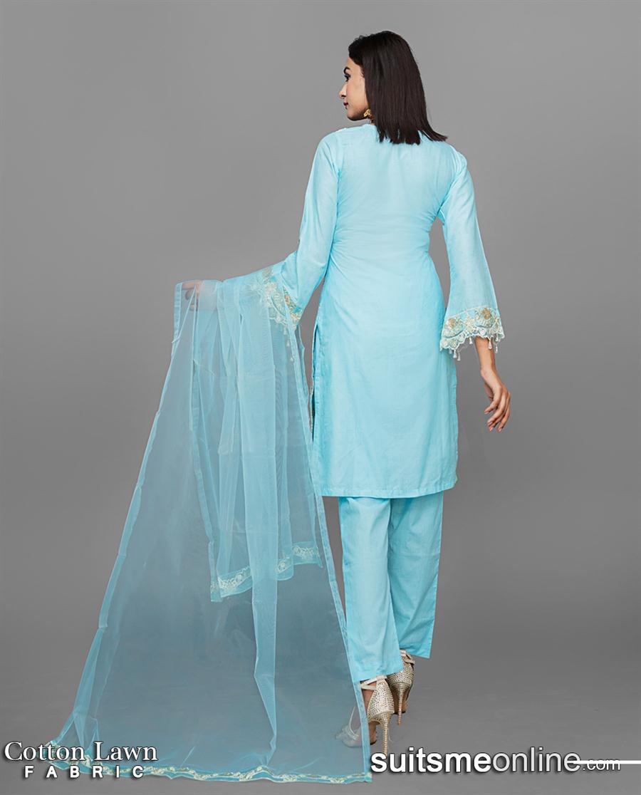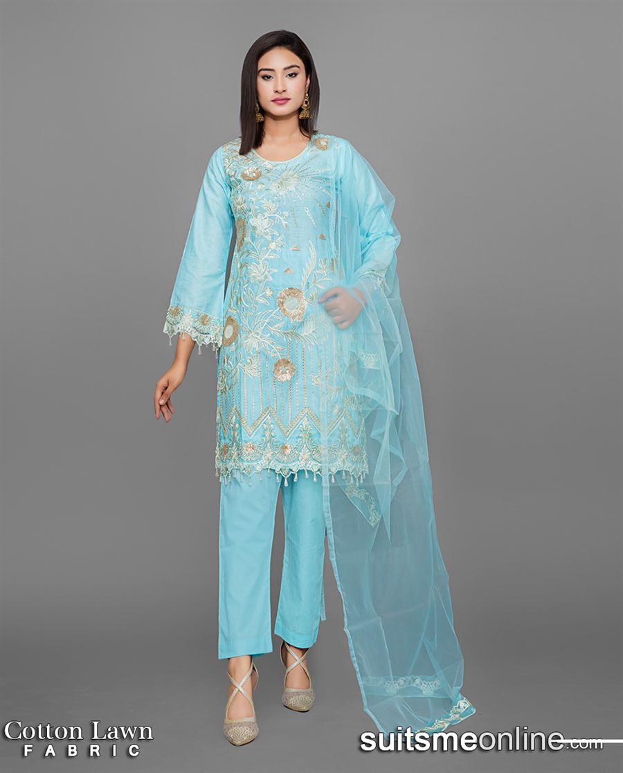 Cotton Lawn 3-Piece suits:The Cotton lawn Shirt with embroidery on front and sleeves embellished with hand work. It is paired with cotton Lawn embroidered trouser and chiffon dupatta.