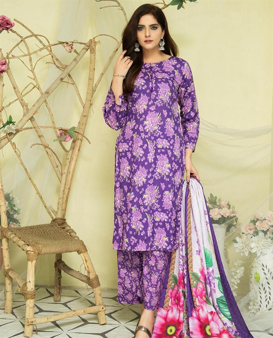 READY TO WEAR - 3 PCS PRINTED KHADDAR SUIT FEATURING A STRIKING PURPLE COLOR AND AN ELEGANT PRINT, THIS SUIT IS DESIGNED TO ENHANCE YOUR STYLE WITH ITS VIBRANT AND MODERN APPEAL. PAIRED WITH BIG PRINTED SHAWL AND TROUSER. MUST HAVE THIS WINTER