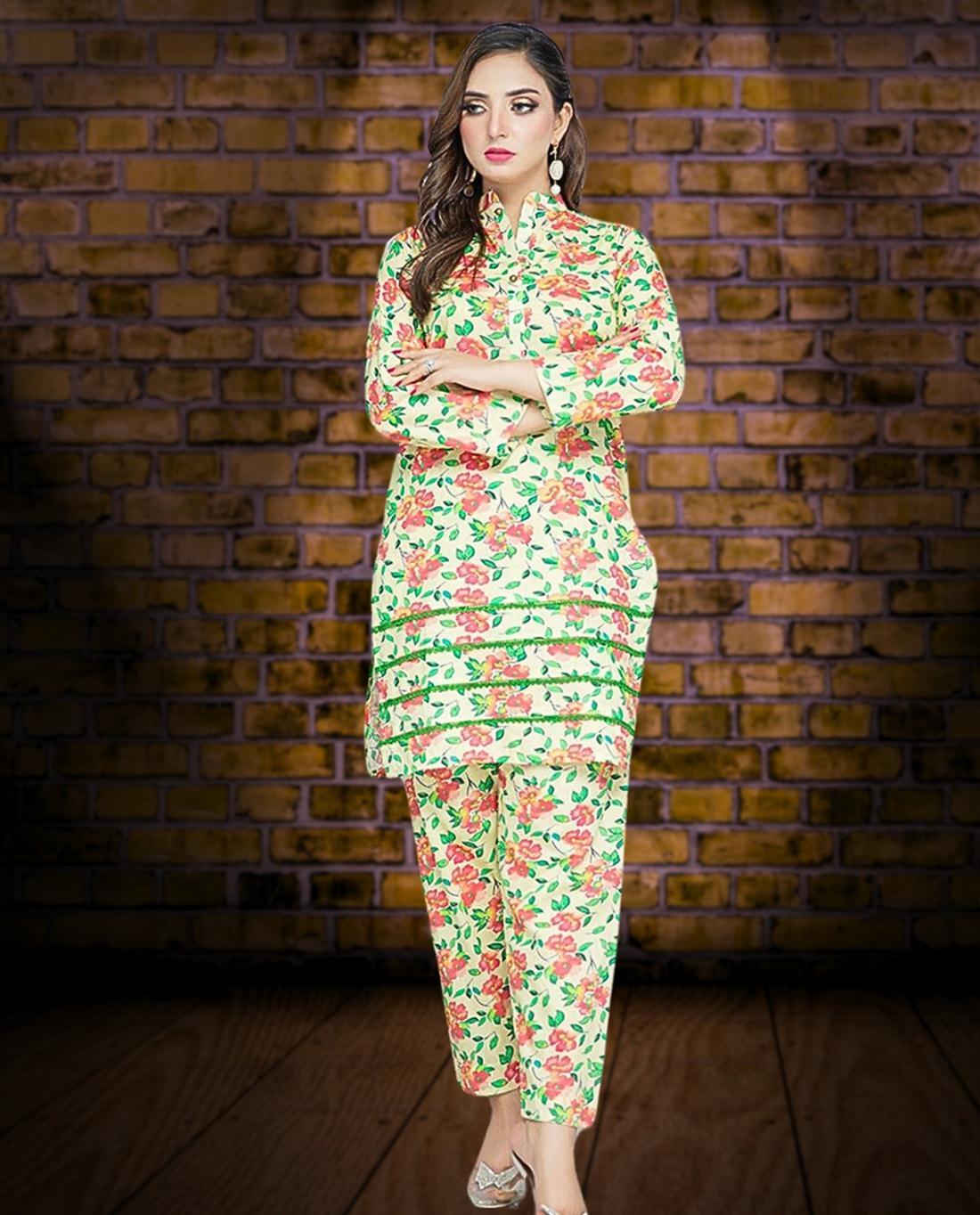 READY TO WEAR - WOMEN’S FLORAL PRINT LAWN TWO-PIECE OUTFIT. SHIRT ADORNED WITH LACE DETAILING. PAIRED WITH SAME PRINT PANTS CRAFTED IN MODERN CUT