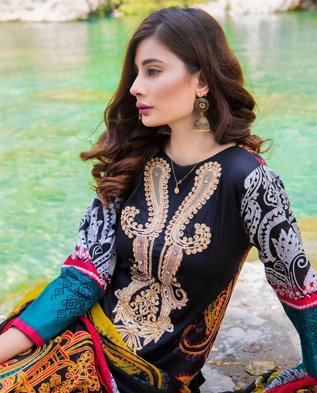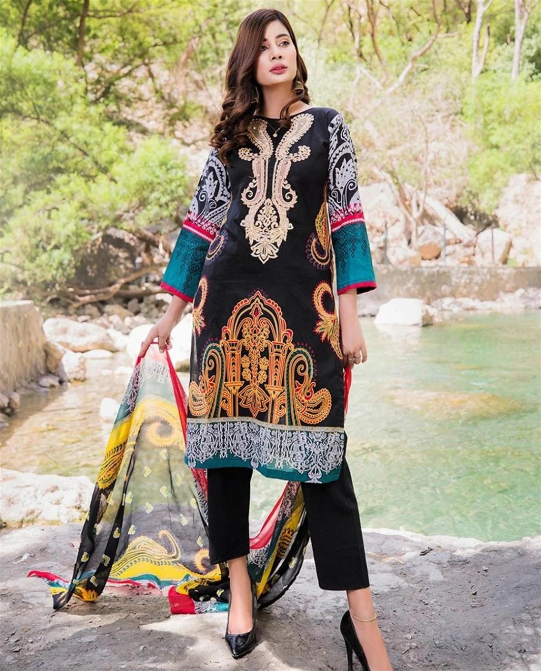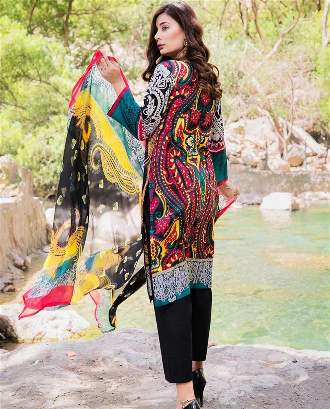 Digital Printed Lawn Shirt With Embroidery On Front Embellished With Hand Work. It Is Paired With Trouser And Dupatta