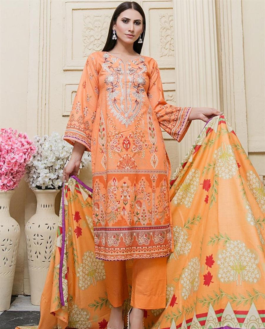 Digital printed lawn shirt with embroidery on front. It is paired with trouser and dupatta